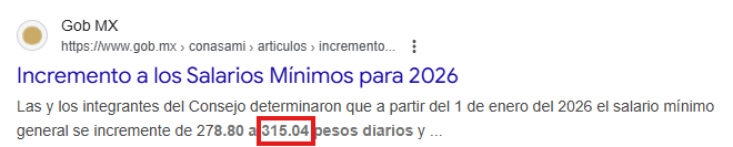 Escriba el monto correspondiente al salario minimo del año que inicia, para este ejemplo tenemos el monto del salario mínimo de 2026 vigente desde el 1ro. de enero de 2026.