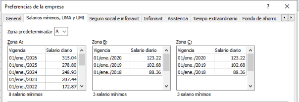 1.- En el módulo de Nóminas, en Herramientas->Preferencias de la empresa, pestaña: «Salarios mínimos, UMA y UMI»