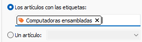 Para seleccionar los artículos que pertenecen a ciertas etiquetas, elegimos la opción «Los artículos con las etiquetas» en la lista de opciones de «Grupo de articulos», nos mostrará una ventana donde empezaremos a escribir la etiqueta deseada y el sistema lo autocompletará.