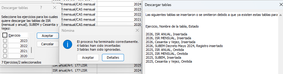 Clic en Aceptar e iniciará el proceso de descarga, a final no informa las tablas que se insertaron/ignoraron en un listado donde aparece separado por coma: el Ejercicio, Nombre de la tabla, Estatus (insertada si no existe, registro insertado si es necesario y omitida si ya existe).
