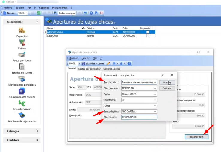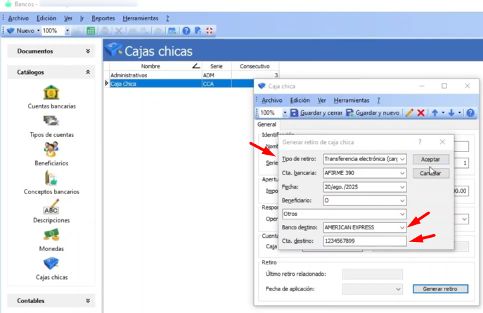 En Microsip sabemos que muchas empresas ya están dejando atrás el uso de efectivo y prefieren manejar su dinero de manera digital. Por eso ahora la caja chica también se puede manejar con transferencias electrónicas. Para hacer el retiro de apertura con este método, solo necesitas dos datos adicionales, el banco de destino y la cuenta de destino.