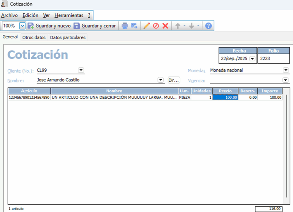 Una de las mejoras más útiles incluidas en la 2da edición de Microsip es la ampliación del espacio para visualizar la clave y descripción de los artículos dentro de los documentos.