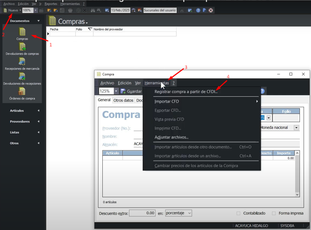 Para registrar una compra a partir del CFDI primero ingresamos al módulo de compras, nos dirigimos a la carpeta de Compras (1) hacemos clic en Nuevo (2) y luego en Herramientas (3) para seleccionar Registrar compra a partir del CFDI (4).