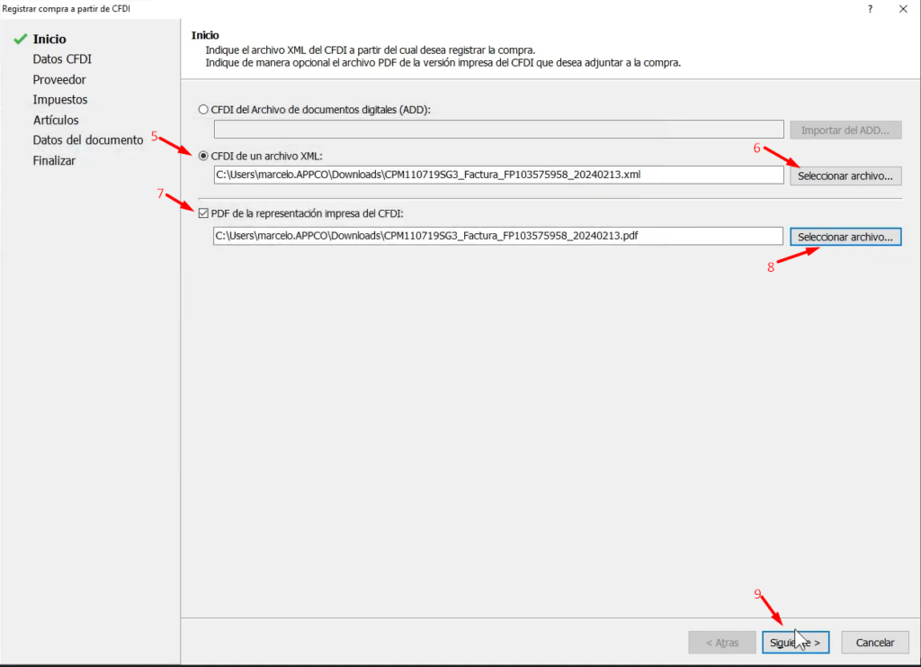 Esto nos abrirá un asistente que nos pedirá definir el origen del CFDI en este caso marcamos la opción CFDI de un archivo XML (5) damos clic en el botón Seleccionar archivo (6) y elegimos el archivo XML en nuestro equipo también podemos adjuntar el archivo PDF, marcamos la opción PDF de la representación impresa del CFDI (7), localizamos en nuestro equipo el archivo con el botón Seleccionar archivo (8), una vez cargados ambos archivos damos clic en Siguiente (9)