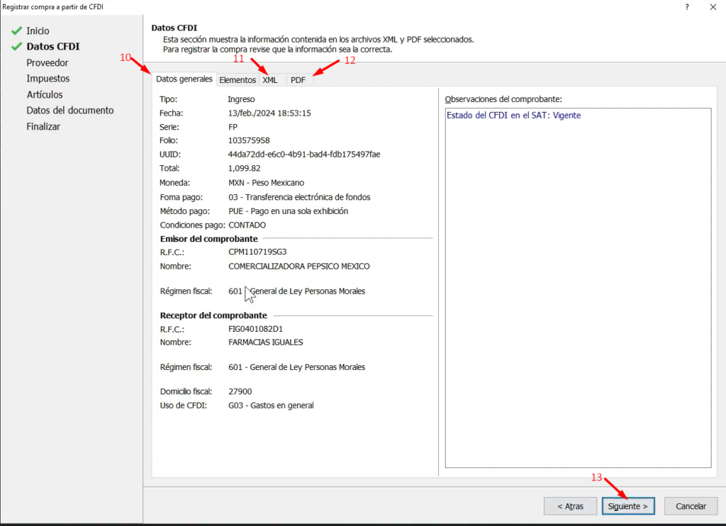 En esta parte podemos visualizar los Datos generales (10) del CFDI que seleccionamos con el asistente nos muestra el XML (11) en formato de árbol y el PDF (12) cargado para tener una referencia clara de la información, clic en Siguiente (13)