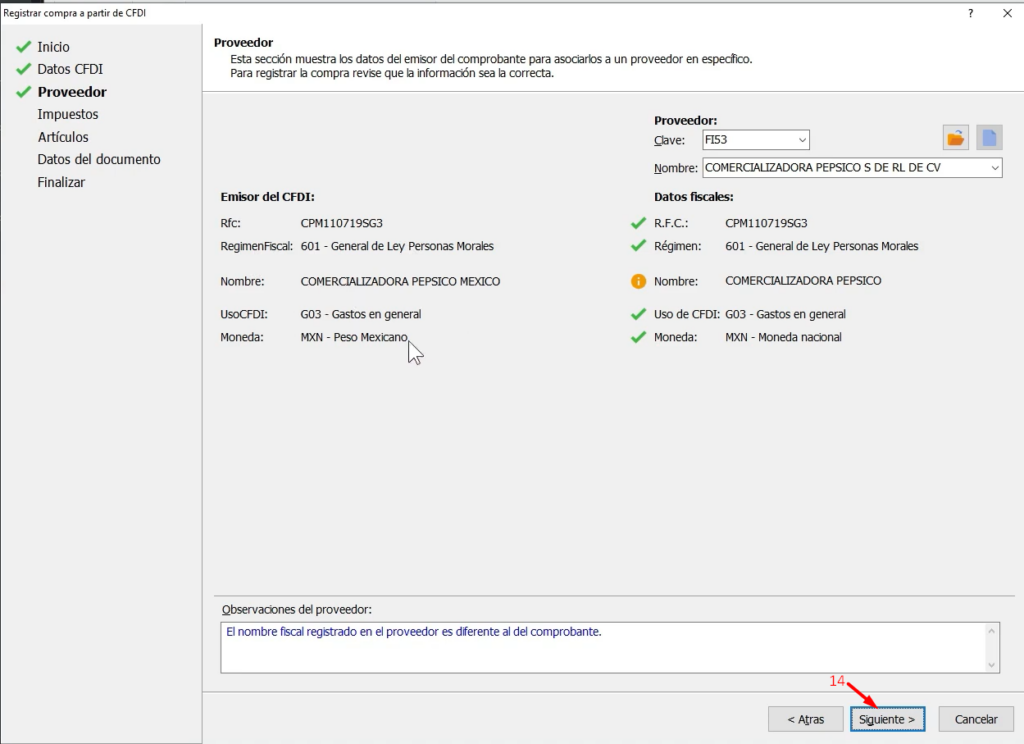 En la sección de proveedor vemos los datos del CFDI asociados, RFC, Régimen fiscal, Nombre del proveedor, uso del CFDI y la Moneda, del lado derecho encontramos cómo esos datos están relacionados con el proveedor registrado en el sistema después pasamos a la sección de impuestos clic en Siguiente (14)