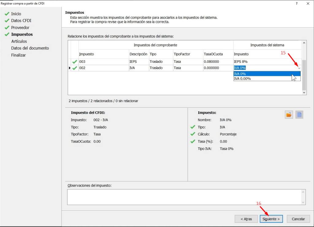 Donde podemos ver cómo fueron relacionados con los valores del sistema si es necesario podemos cambiar esta relación directamente desde el selector (15) clic en Siguiente (16)
