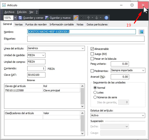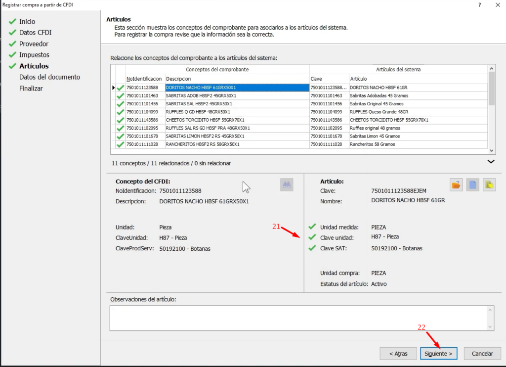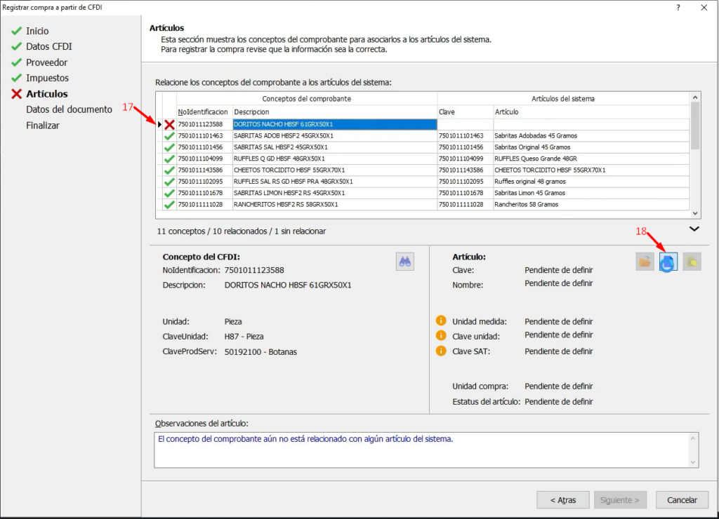 En la sección de Artículos aparecen todos los conceptos del comprobante que ya están asociados a los artículos del sistema pero puede que algunos no estén vinculados esto puede suceder porque el número de identificación del CFDI no coincide con las claves del proveedor o con las claves del artículo en nuestro catálogo también es posible que la descripción del concepto no coincida con ningún artículo existente en el sistema si esto pasa podemos generar el artículo directamente desde esta ventana solo seleccionamos el Concepto del comprobante (17) y hacemos clic en el botón para Abrir el catálogo (18) de artículos.