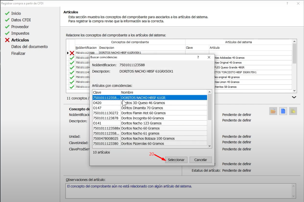 Además tenemos la opción de usar la nueva funcionalidad de búsqueda por coincidencia que busca artículos basándose en la descripción del concepto una vez que encontramos el artículo correcto lo seleccionamos (20)