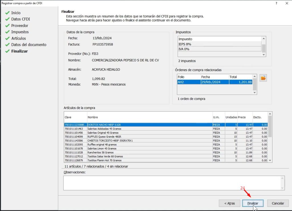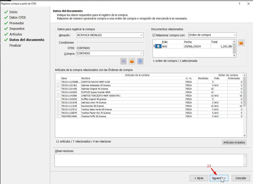 En la sección final completamos los datos faltantes del registro de la compra como el almacén y las condiciones de pago que en algunos casos vienen directamente mapeadas desde el CFDI, aquí también podemos relacionar documentos como órdenes de compra basta con marcar la casilla correspondiente y el asistente se encargará de relacionar automáticamente las partidas de la nueva compra con las de la orden seleccionada damos clic en Siguiente (23)
